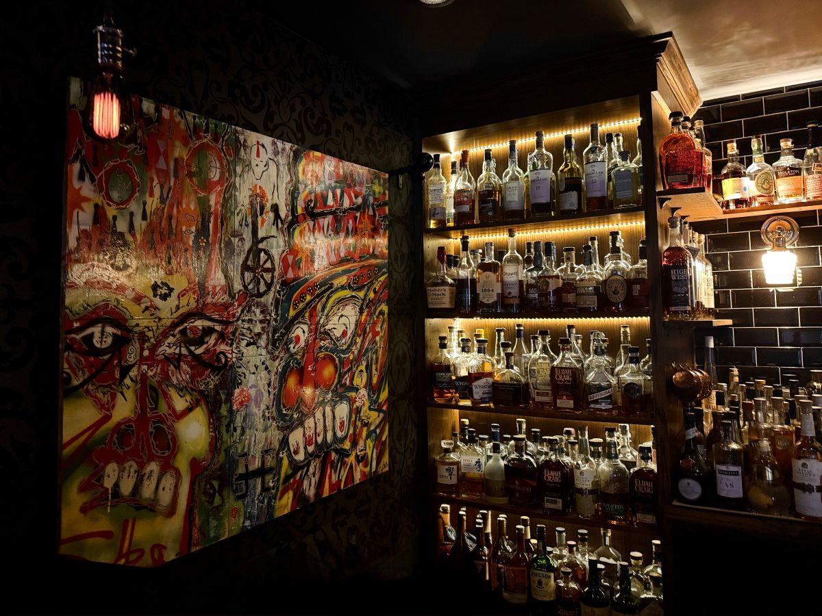 Inkwell is designed for reflection. It’s dark and intimate—moody yet romantic. Amber Edison bulbs cast a soft glow across the bar, creating a warmth that invites conversation. The bar itself is a showpiece: black subway tile walls with dark wood shelving lined with gently lit rows of bourbon and whiskey bottles. A mirrored backsplash is partly covered with dollar bills and mementos left by regulars. Along the walls hang portraits of literary greats—writers who might have found refuge in a place like this. Under the amber light, their faces take on a cinematic glow, as if one might glance over and find Hemingway or Fitzgerald sipping an Old Fashioned beside you.