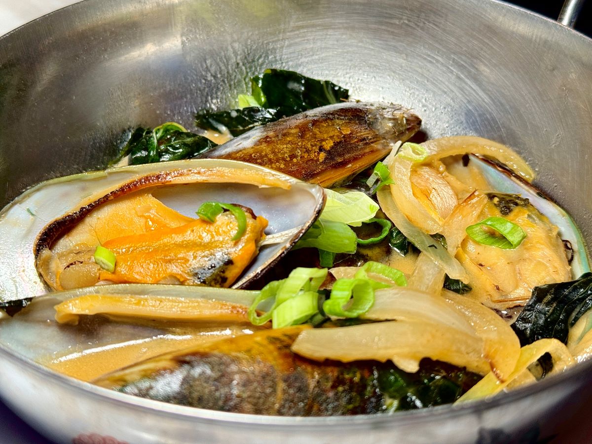 The coconut basil mussels arrive steaming hot, the meat tender and juicy in its broth. The broth leans savory, with coconut up front and a nutty umami depth underneath.